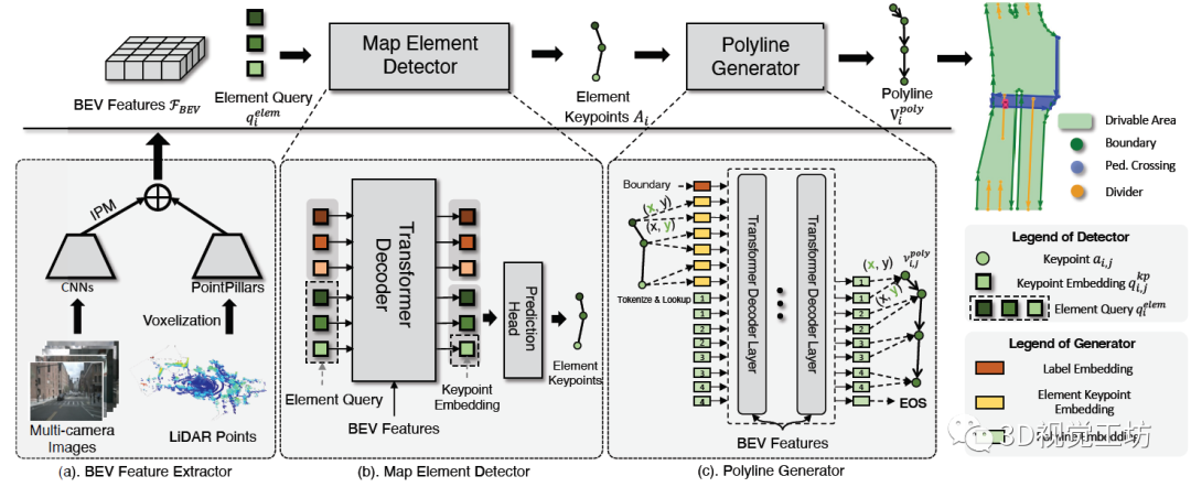 其实,VectorMapNet的网络架构就是三个部分:投影、检测、生成。投影就类似HDMapNet,将输入的相机和雷达转换到BEV视角,得到BEV特征图。检测就是提取HD地图元素,具体来说就是基于Query来提取关键点,这里的关键点可以是车道线的起点、终点、中间点。这个检测的思想其实非常巧妙,它没有在中间过程就得到非常多的输出点,而是选取了更简洁更统一化的表示!生成就是指得到折线化矢量化的HD地图,也是一个自回归模型,具体思路也是基于Transformer回归每个顶点坐标。