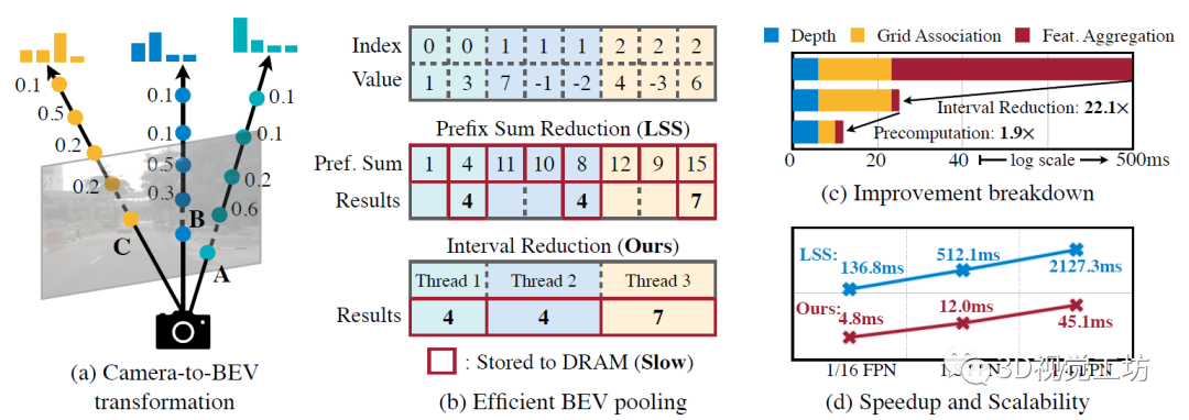 通过优化的BEV池化,摄像头到BEV的转换速度提高了40倍:延迟从500ms减少到12ms(仅为模型端到端运行时间的10%),并且可以在不同的分特征辨率之间很好地扩展。