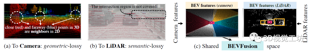 这篇文章其实解答了困惑我很久的一个问题,就是为什么不先把图像投影到雷达,或者雷达投影到图像,然后再一起转到BEV空间下,而是要分别提取特征再到BEV空间下进行特征融合。这是因为相机到激光雷达的投影丢掉了相机特征的语义密度,对于面向语义的任务(如三维场景分割)有非常大的影响。