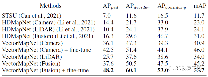 结果显示,VectorMapNet这种基于检测的方案性能远超HDMapNet。例如在人行横道上的预测AP提升了几乎32个点,在整体的mAP上也提升了22.7个点。