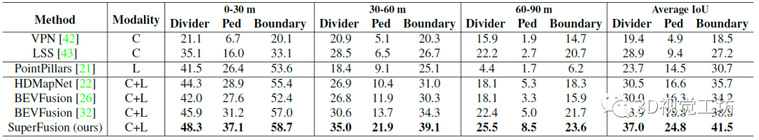 定性和定量结果也表明,SuperFusion相较于其他HD语义地图构建方案来说,性能提升很明显,尤其是长距离建模。这种长距离建模能力使得SuperFusion更有利于自动驾驶下游任务。