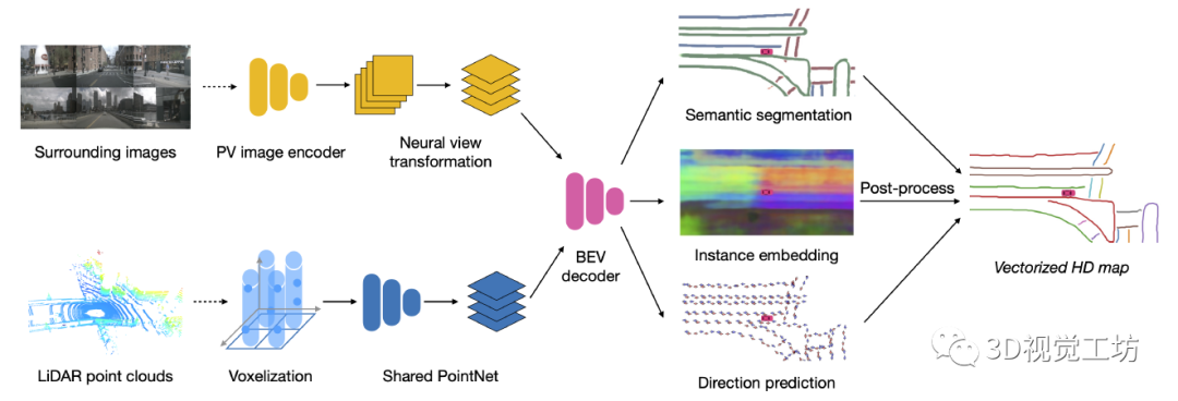 清华大学2021年7月开源的HDMapNet,其主要思路是输入环视相机和雷达点云,将相机和雷达点云分别进行特征提取后投影到BEV空间,在BEV空间里进行特征融合。注意,在BEV空间里进行特征融合是非常有优势的!之后,便是在BEV空间内进行解码。解码器共有三个输出,第一是地图的语义分割结果,里面包含了地图里哪个是车道线、哪个是路标、哪个是人行横道线。第二是实例Embedding,里面包含了实例信息,主要表达车道线和车道线直接、路标和路标之间的实例区分。第三是方向信息,主要表达了HD地图中每条线的方向。最后,语义分割HD地图首先和实例Embedding进行融合,得到实例化的HD地图,并融合方向信息以及NMS得到矢量化的HD地图。
