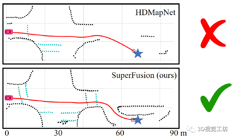 如下图所示,红色汽车代表汽车当前的位置,蓝色星星代表目标。结果显示,SuperFusion在生成短程(30 m)的HD语义地图基础上,预测高达90 m距离的远程HD语义地图。这给自动驾驶下游路径规划和控制模块提供了更强平稳性和安全性。