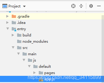 项目新建后会默认打开app.js,这时只需要点图中的十字图标,就可以很快定位到文件了。离pages只有一步之遥。省得你再去手动点entry -> src -> main -> js -> default