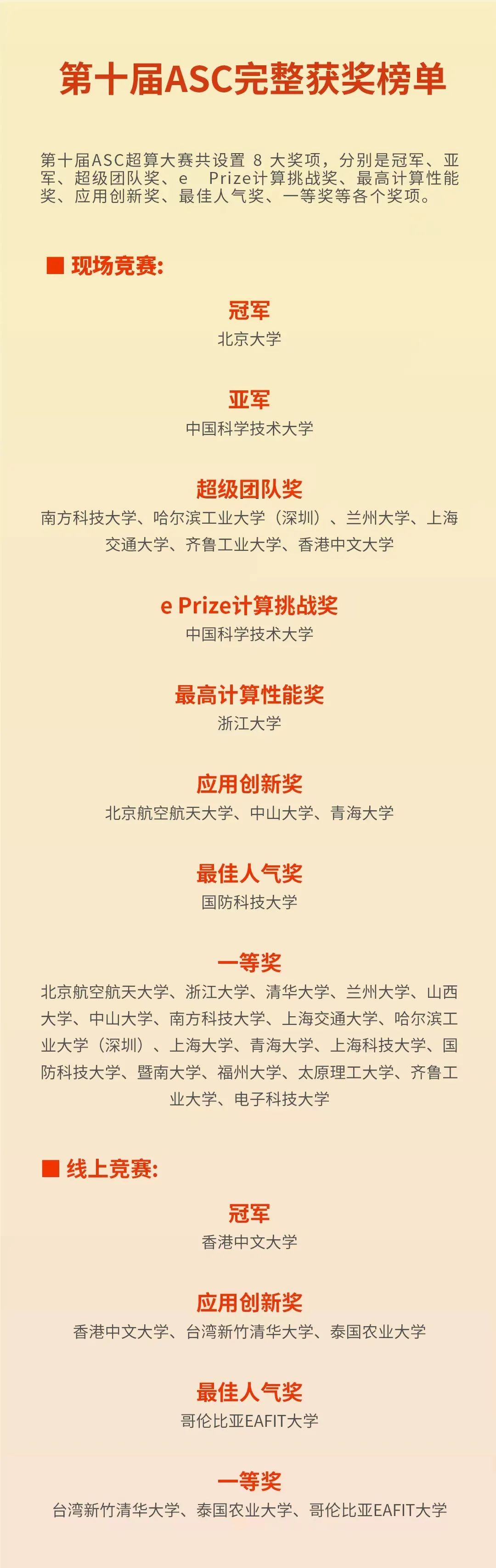 北京大学首次获得ASC决赛冠军,而东道主中国科学技术大学获得亚军,香港中文大学获得线上竞赛冠军。