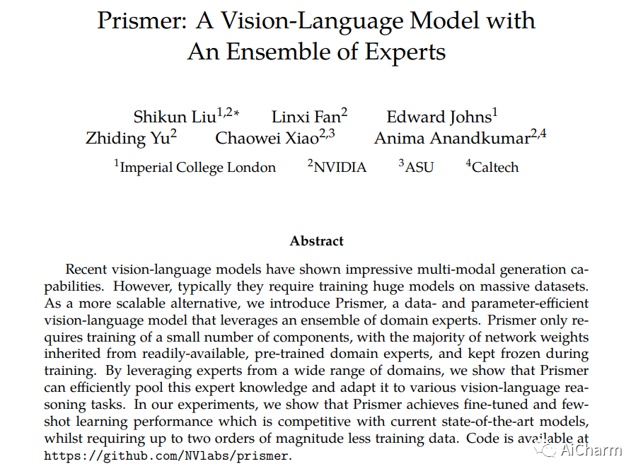 1.Prismer: A Vision-Language Model with An Ensemble of Experts