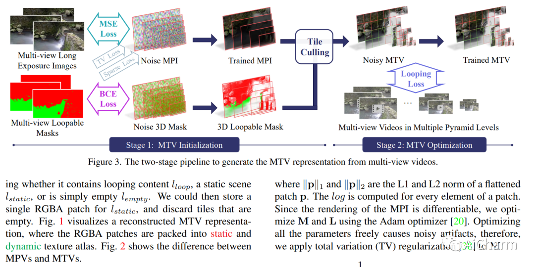 循环视频是可以无限循环播放的短视频剪辑,没有明显的接缝或瑕疵。它们提供了一种非常有吸引力的方式来捕捉自然场景的动态。现有方法主要限于二维表示。在本文中,我们向前迈进了一步,提出了一种实用的解决方案,可以在动态 3D 循环场景上实现身临其境的体验。关键挑战是考虑来自异步输入的每个视图循环条件,同时保持 3D 表示的视图一致性。我们提出了一种新颖的稀疏 3D 视频表示,即 Multi-Tile Video (MTV),它不仅提供了视图一致的先验,而且大大减少了内存使用,使 4D 体积的优化变得易于处理。然后,我们引入了一个两阶段流水线来从完全异步的多视图视频构建 3D 循环 MTV,没有时间重叠。在优化过程中采用了一种基于视频时间重定向算法的新型循环损失来循环 3D 场景。我们框架的实验表明,即使在移动设备上也能实时成功生成和渲染逼真的 3D 循环视频。