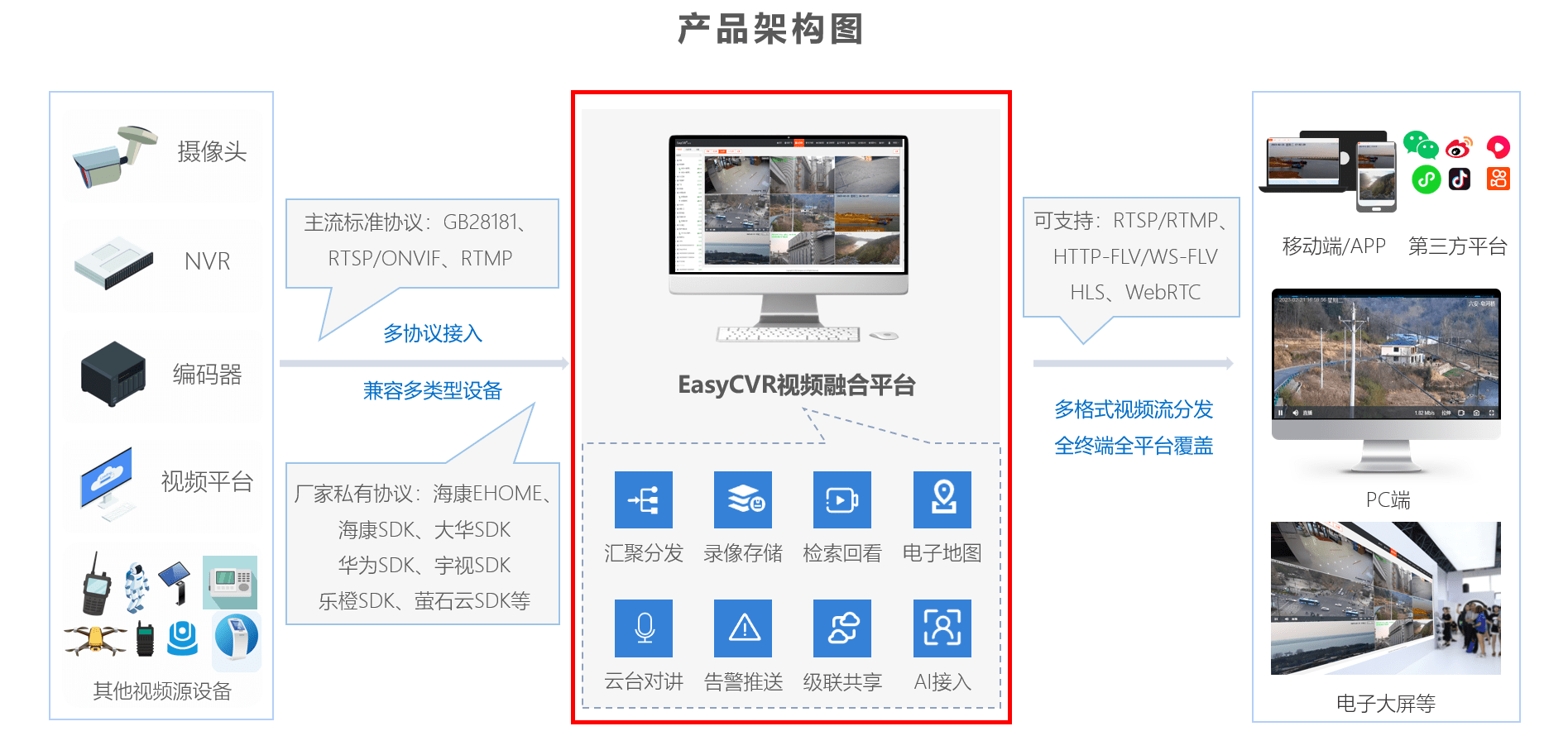 EasyCVR基于云边端智能协同架构,具有强大的设备接入、视频汇聚管理、全网分发、按需调阅、鉴权播放、智能分析等视频能力与服务。平台开放度高、兼容性强、可支持灵活拓展与第三方集成。