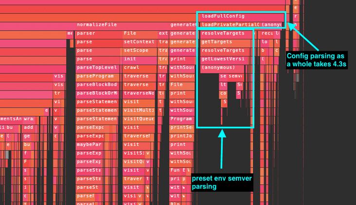 在截图中有点难看清楚,但其中一个占用大量时间的功能是来自 semver 包的代码,这个包也是 npm 的 cli 中使用的包。嗯?semver 与 babel 有什么关系?直到一段时间后我才明白:它是用于解析 @babel/preset-env 的 browserlist 目标的。虽然 browserlist 设置可能看起来相当简短,但最终它们被扩展为大约 290 个单独的目标。