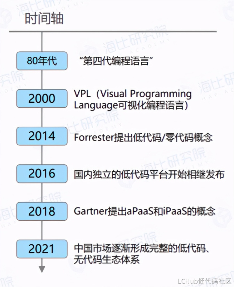 随着高级编程语言不断发展成熟,以及国内外计算机人才的培养规模逐渐扩大,2010-2015年称得上是传统软件和SaaS软件兴起的时代,市场规模稳步增长。就是在这一时期,编程人员承接了许多软件开发项目。他们发现:软件的功能大同小异,重复度很高,导致很大部分的软件开发成本都浪费在重复的功能编程上。 而Forrester,一家国际知名的技术和市场调研公司,敏锐地发现了这一问题,并在2014年首次提出低代码和零代码的概念:只需用很少甚至几乎不需要代码就可以快速开发出系统,并可以将其快速配置和部署的一种技术和工具。随后在2018年,Gartner提出aPaaS(应用平台即服务)和iPaaS(集成平台即服务)的概念。