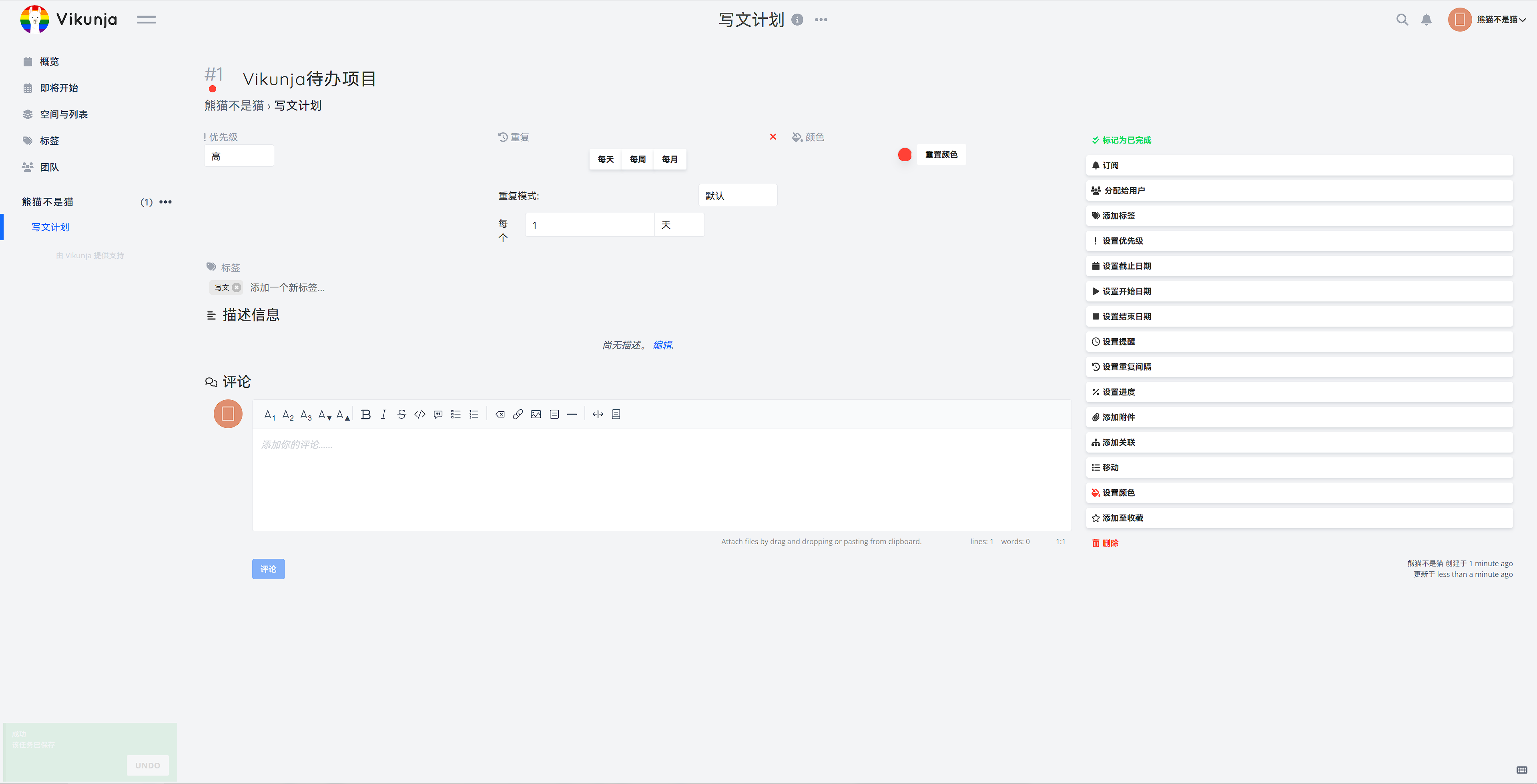 决定要改那就需要定好每天的日程,于是熊猫找到了这么一款程序——Vikunja。一款组织您的生活的待办事项应用程序,你可以将你的每日行程放在上面,在部署体验后发现还是挺好用的一个项目,于是今天分享给大家。