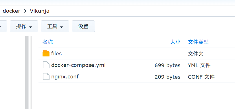 }再进入到docker文件夹中新建一个vikunja文件夹,将两个文件放入其中。并新建一个子文件夹files。