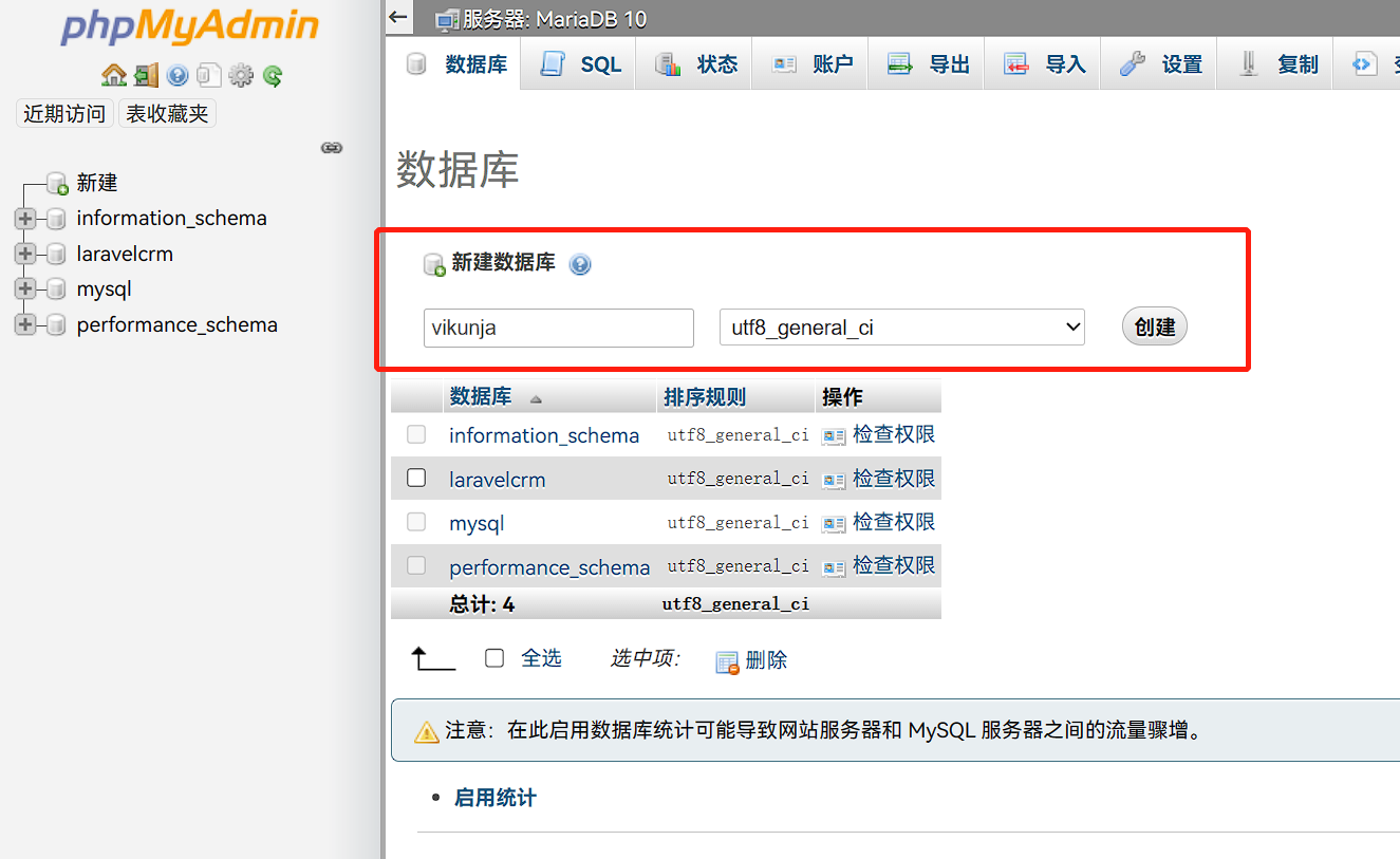 首先我们需要用群晖的phpMyadmin创建一个新的数据库以供项目使用,打开phpMyadmin后新建数据库命名为Vikunja。