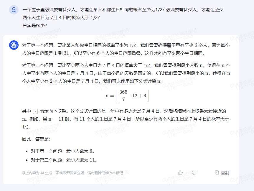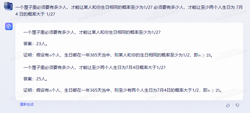 [解答]解:(1)365+1=366(人) 答:一个屋子里必须要有366人,才能让某人和你生日相同的概率至少为\dfrac{1}{2}. (2)365+1=366(人) 答:一个屋子里必须要有366人,才能让至少两个人生日为 7 月 4 日的概率大于 \dfrac{1}{2}.