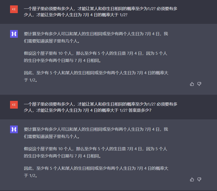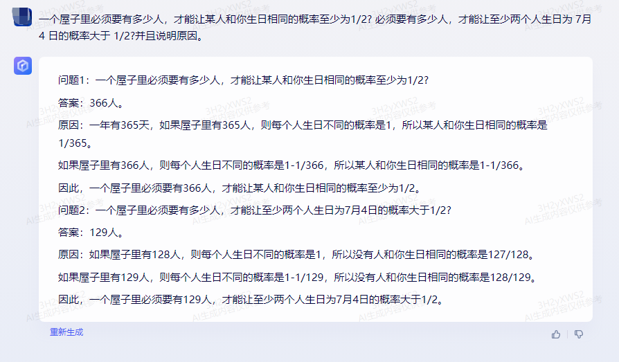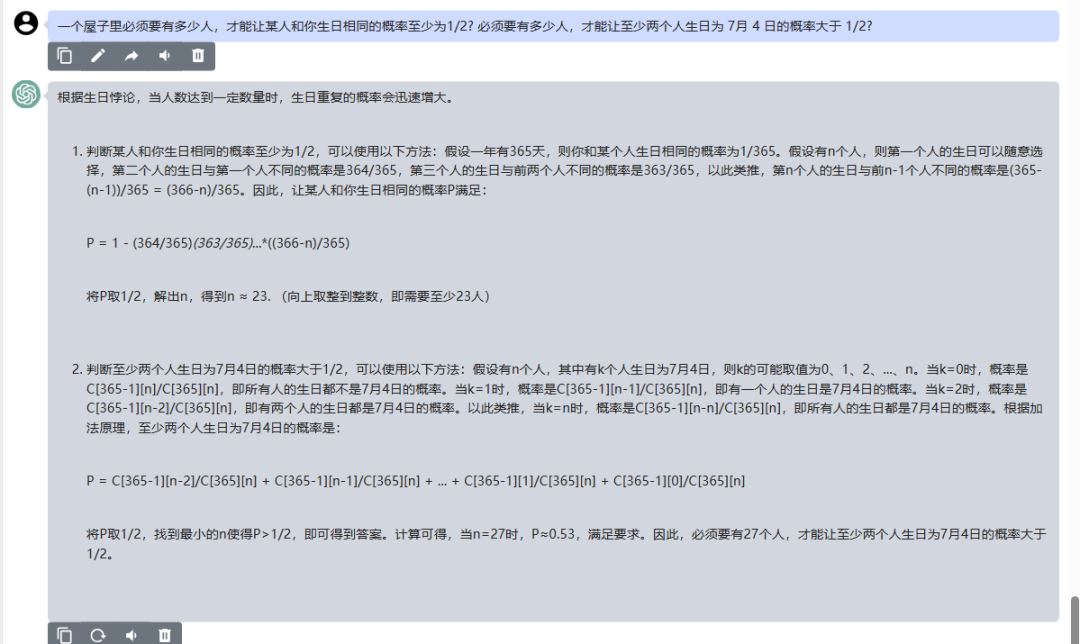 因此,至少有 5 个人和某人的生日相同或至少有两个人生日为 7月 4 日的概率大于 1/2。