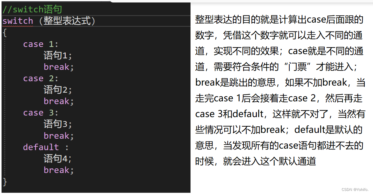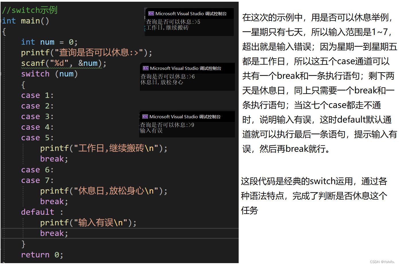 作为分支语句中的第二种语句,switch语句的出现可谓是弥补了 if 多分支语句过于冗长的缺点,switch语句能通过短短几行代码实现 if 多分支多语句的功能,比如输入1,打印星期一,输入5,打印星期五,让 if 来完成这个需求需要7个 if else语句,而交给switch只需要7句case。