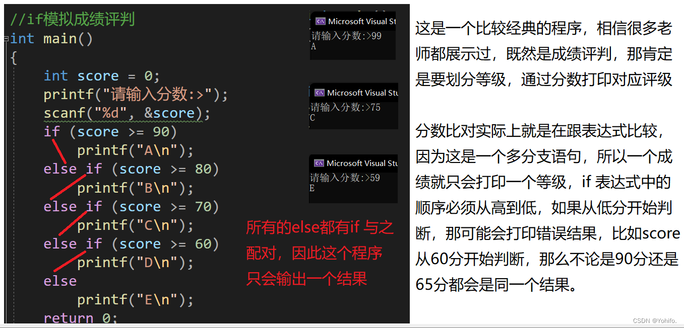 }if 使用注意事项:if 语句在判断时,若为变量和常量相比较,可以把常量写在左边,这样可以有效避免少些一个 = 的小问题。else 语句在使用时要注意与 if 的匹配,避免悬空问题。如果对于各语句间的逻辑模糊不清,可以通过添加语句块 { } 的方式使程序可读性更强。if 语句可以嵌套使用。