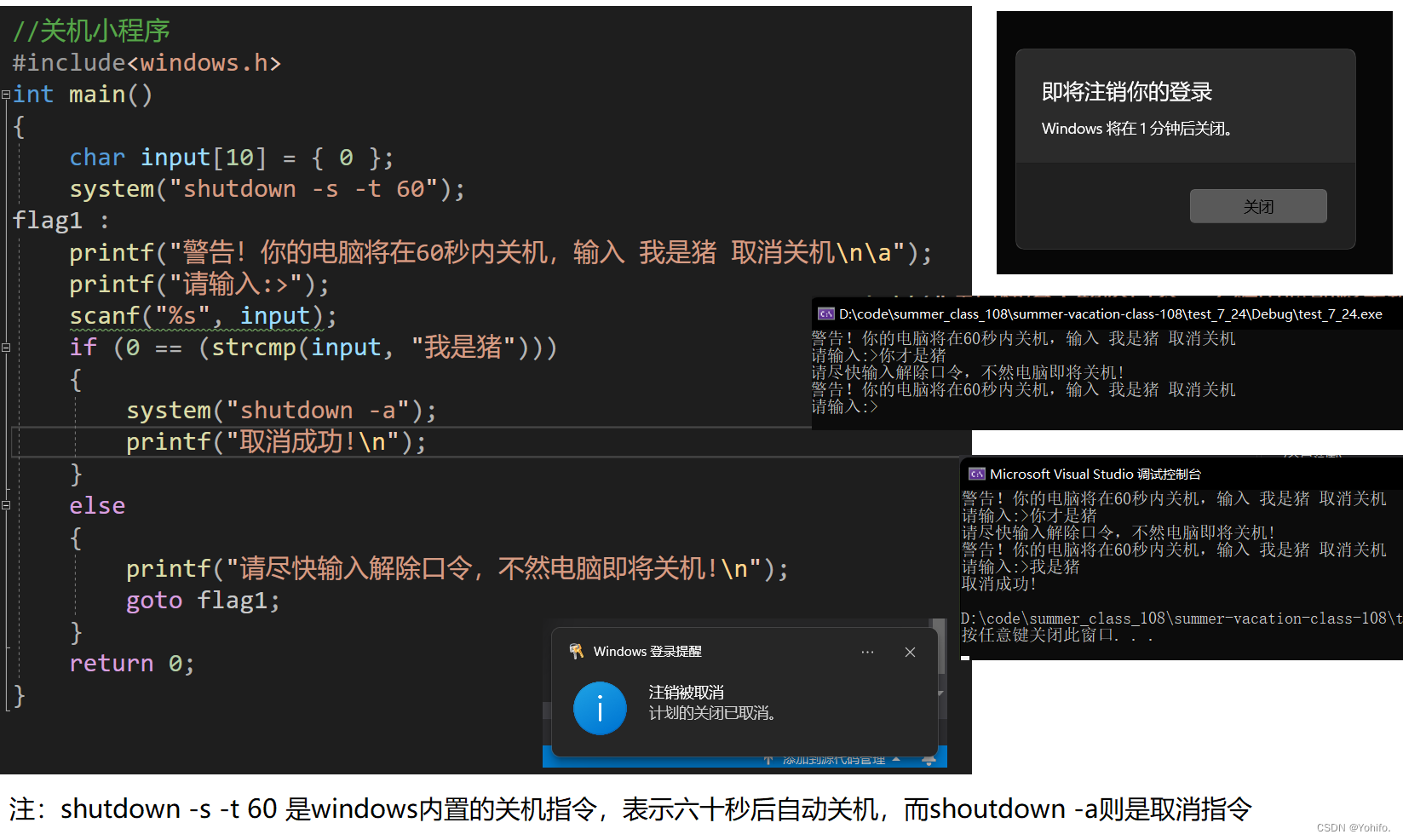 }从以前的笼统解释,到现在的详细分析,变的是内容,不变的是初心。分支与循环语句的知识我已经给大家讲解完毕了,包括具体用例和注意事项等,还有结尾的关机小程序很有意思,如果有需求,还可以加上倒计时之类的东西,让整个程序更有压迫感。以上就是本篇文章的全部内容了,如果觉得写的还不错的话可以一键三连,当然一个小小的点赞也能让我很开心,对知识的分享欲是我继续创作的最大动力,希望大家可以期待我的下篇博客——函数。