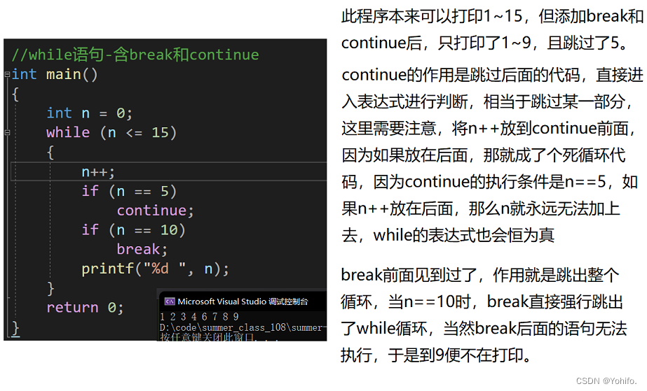 }while使用注意事项:while中的break是用于永久终止循环的。continue是用于终止本次循环的。在使用while循环时要注意表达式逼近的语句,比如上面的n++,如果不加这句话,while会变成死循环