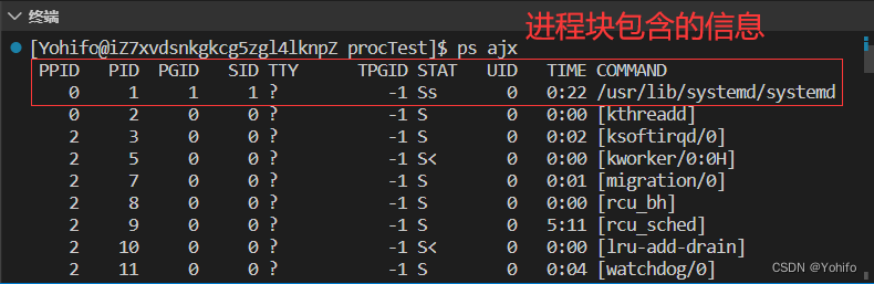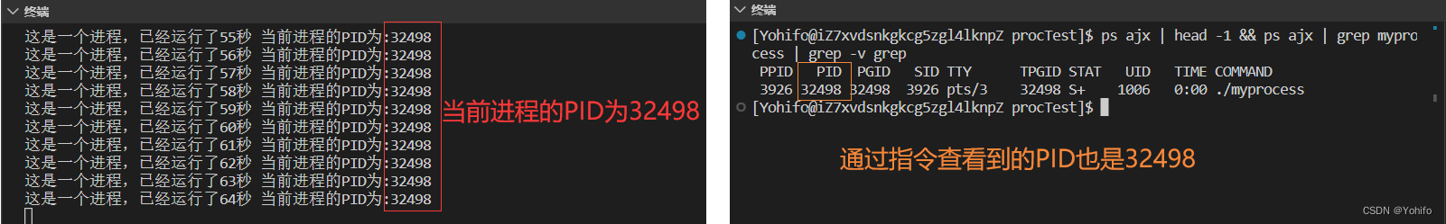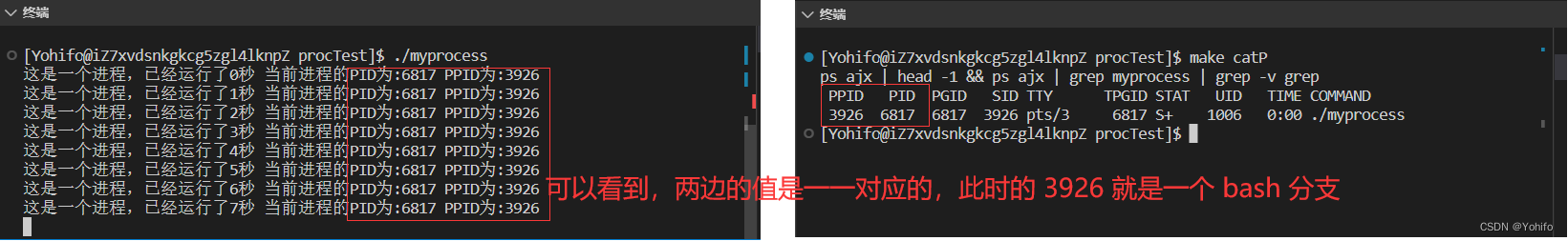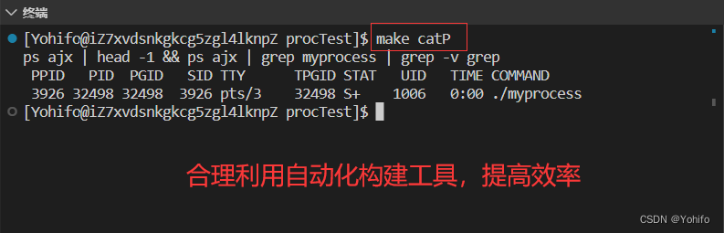 ps ajx | head -1 && ps ajx | grep myprocess | grep -v grep其中的 make catP 指令就是我们刚刚查看 进程 的那一大串指令
