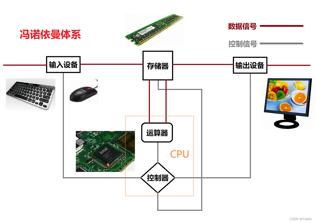 我们今天所有的计算机都离不开 冯诺依曼 体系,这位伟大的计算机科学家早在二十世纪四十年代就提出了这种结构,即计算机应由五部分组成:输入设备、存储器、运算器、控制器、输出设备