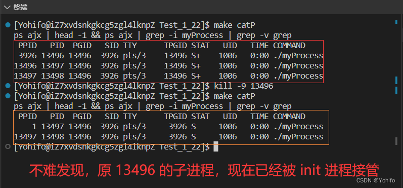 这句话的含义是当我们销毁 父进程 后,它所创建的 子进程 并不会跟着被销毁,而是被 init 1号进程接管,成为一个 孤儿进程