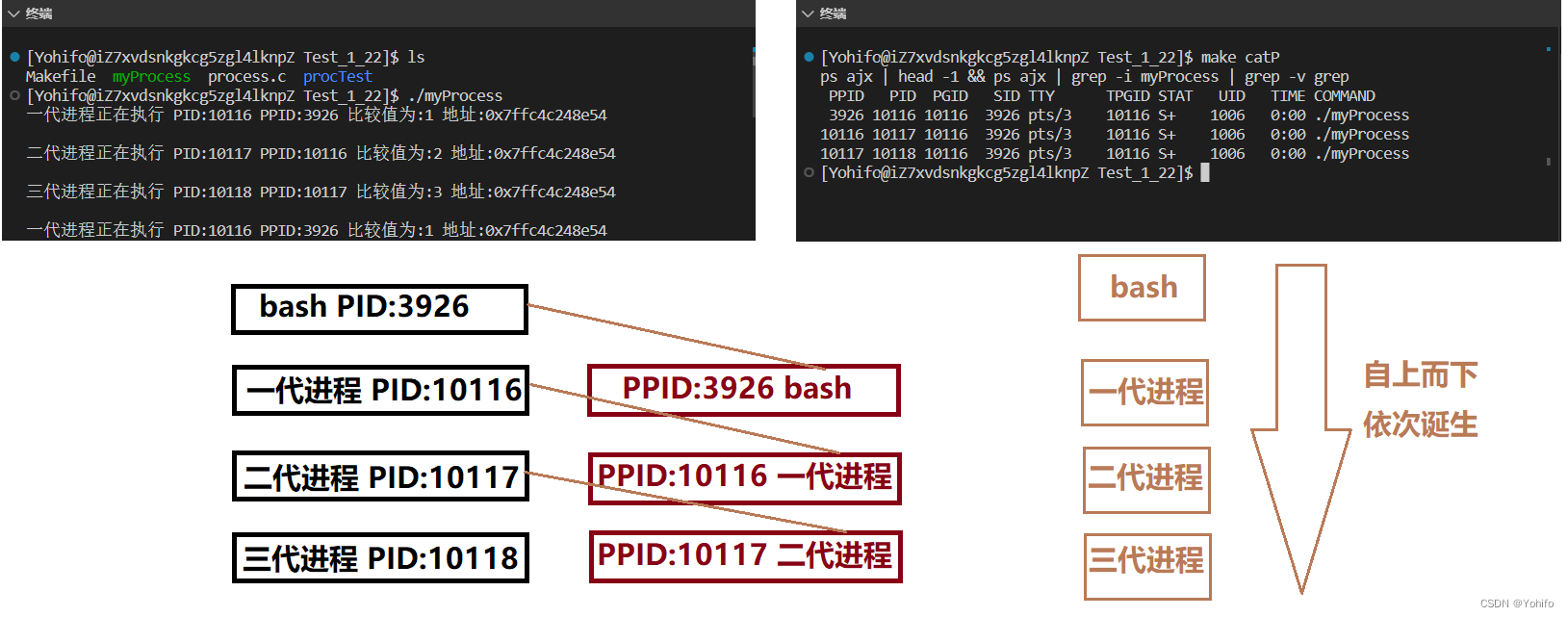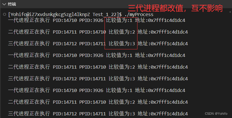 printf("一代进程正在执行 PID:%d PPID:%d 比较值为:%d 地址:%p\n\n", getpid(), getppid(), val, &val);