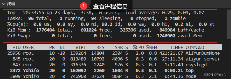$ top这个指令之前有介绍过,相当于Windows中的 ctrl+alt+del 调出任务管理器一样,top 指令能直接调起 Linux 中的任务管理器,显然,任务管理器中包含有进程相关信息