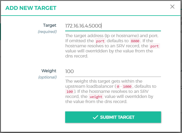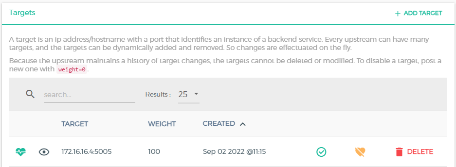 上游创建完成后,在上游列表中即可看到刚刚创建的上游,点击DETAILS按钮进入详情页,然后点击Targets即可看到目标节点列表,随后点击ADD TARGET按钮进入添加目标节点界面。