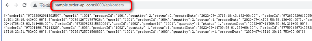 其次,在浏览器中进行验证:http://sample.order-api.com:8000/api/orders