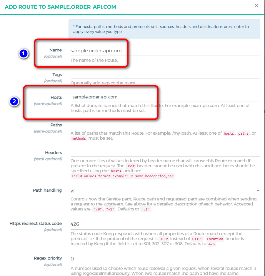 在Services列表点击新创建的这个sample.order-api.com进入详情页,然后点击Routes,即可看到路由列表。我们刚刚说到,一个服务可以绑定多个路由。在路由列表,点击ADD ROUTE即可添加路由。