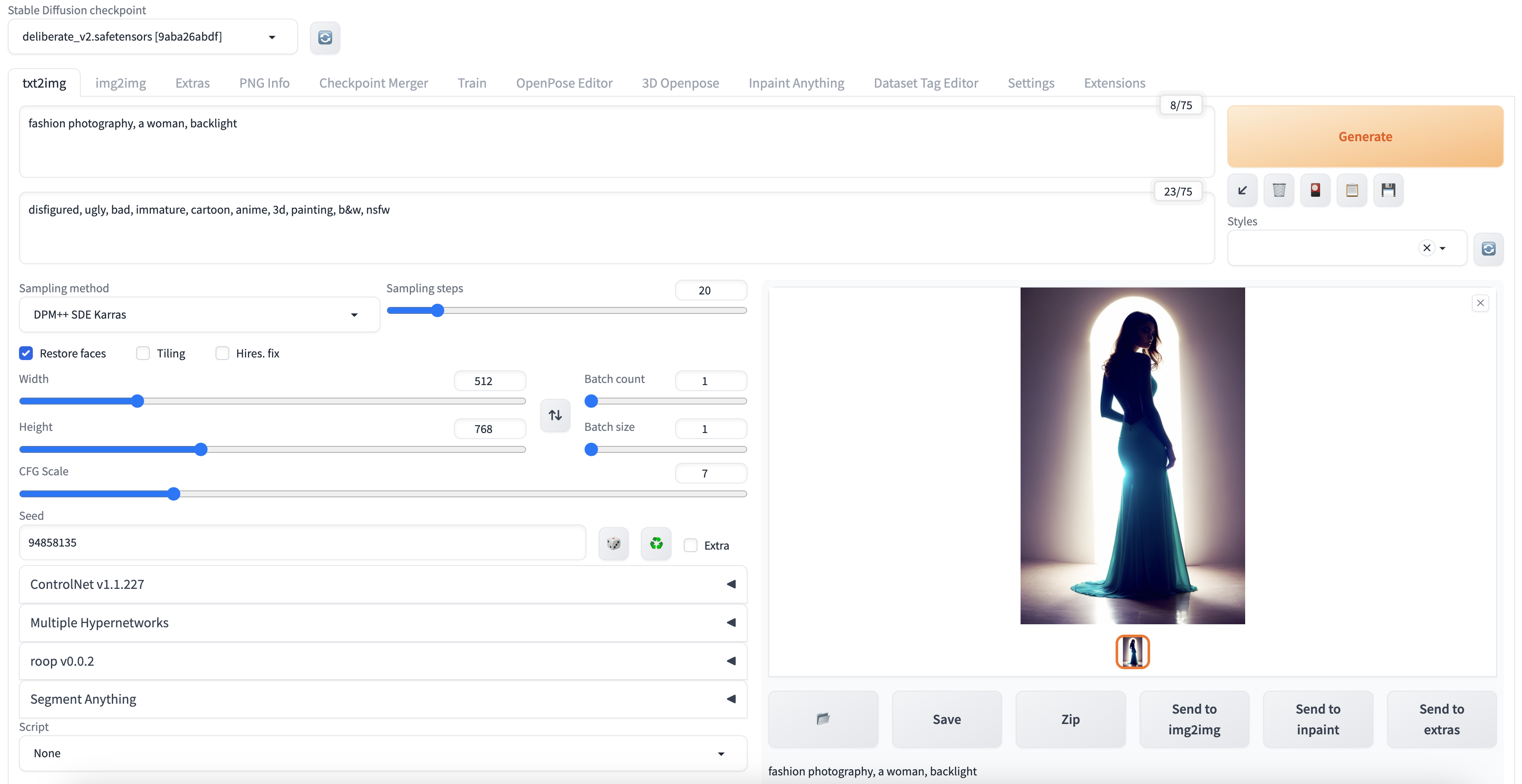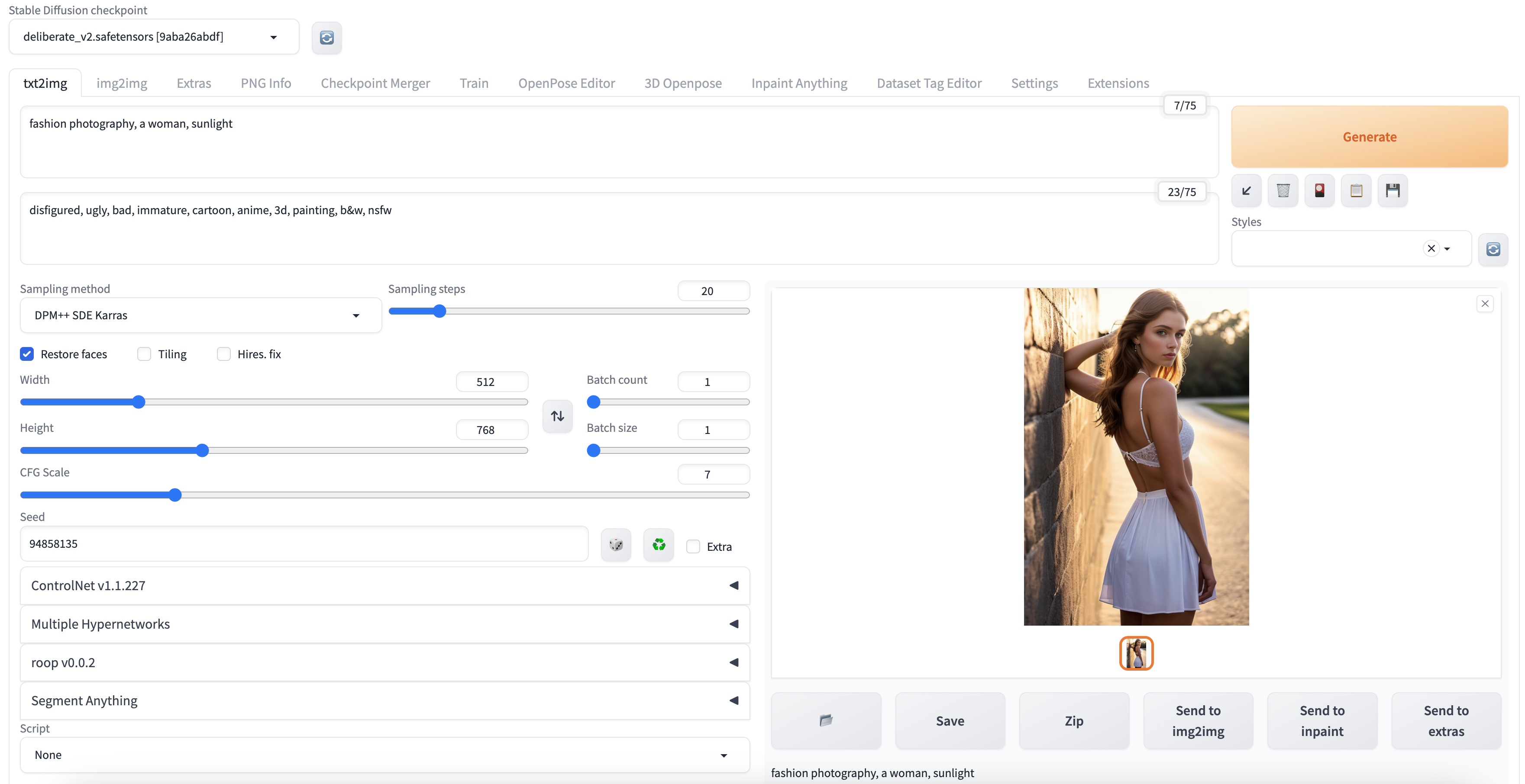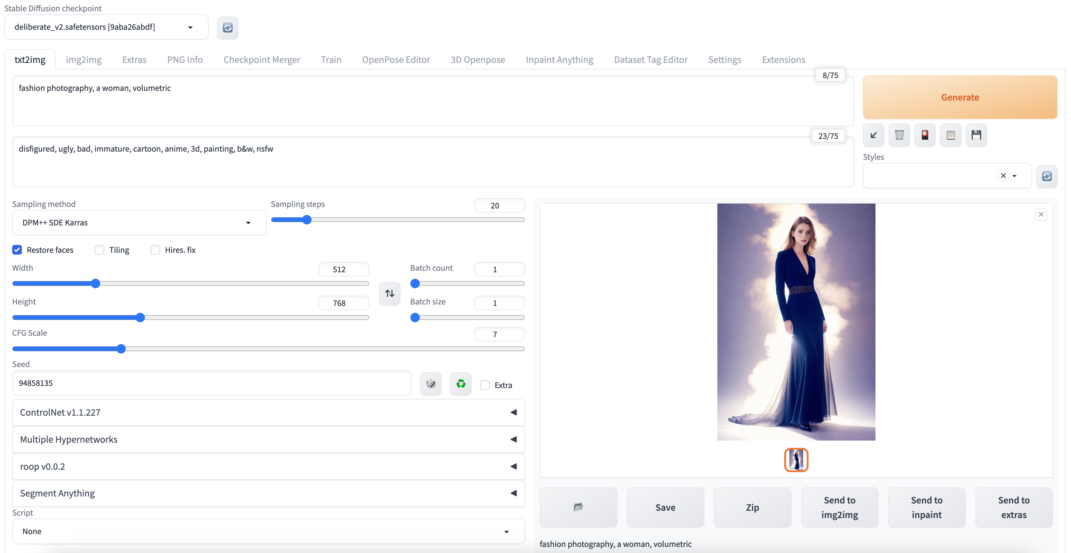 Steps: 20, Sampler: DPM++ SDE Karras, CFG scale: 7, Seed: 94858135, Face restoration: CodeFormer, Size: 512x768, Model hash: 9aba26abdf, Model: deliberate_v2, Version: v1.3.2