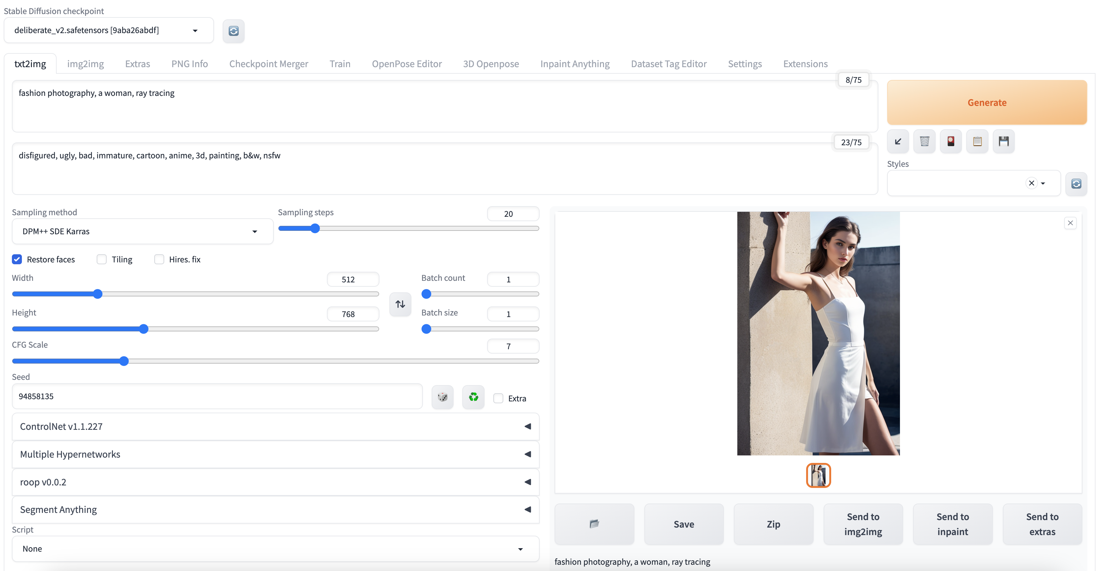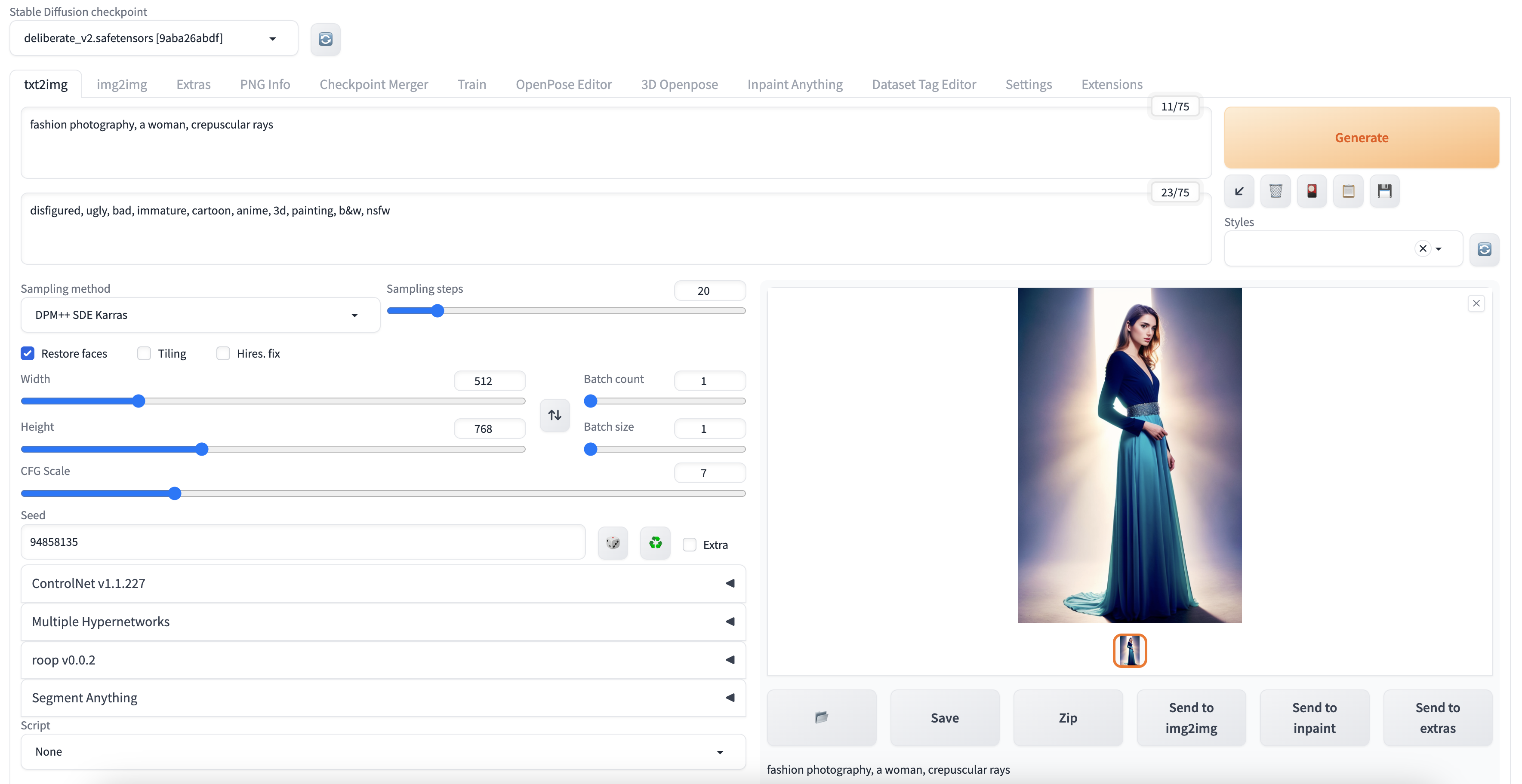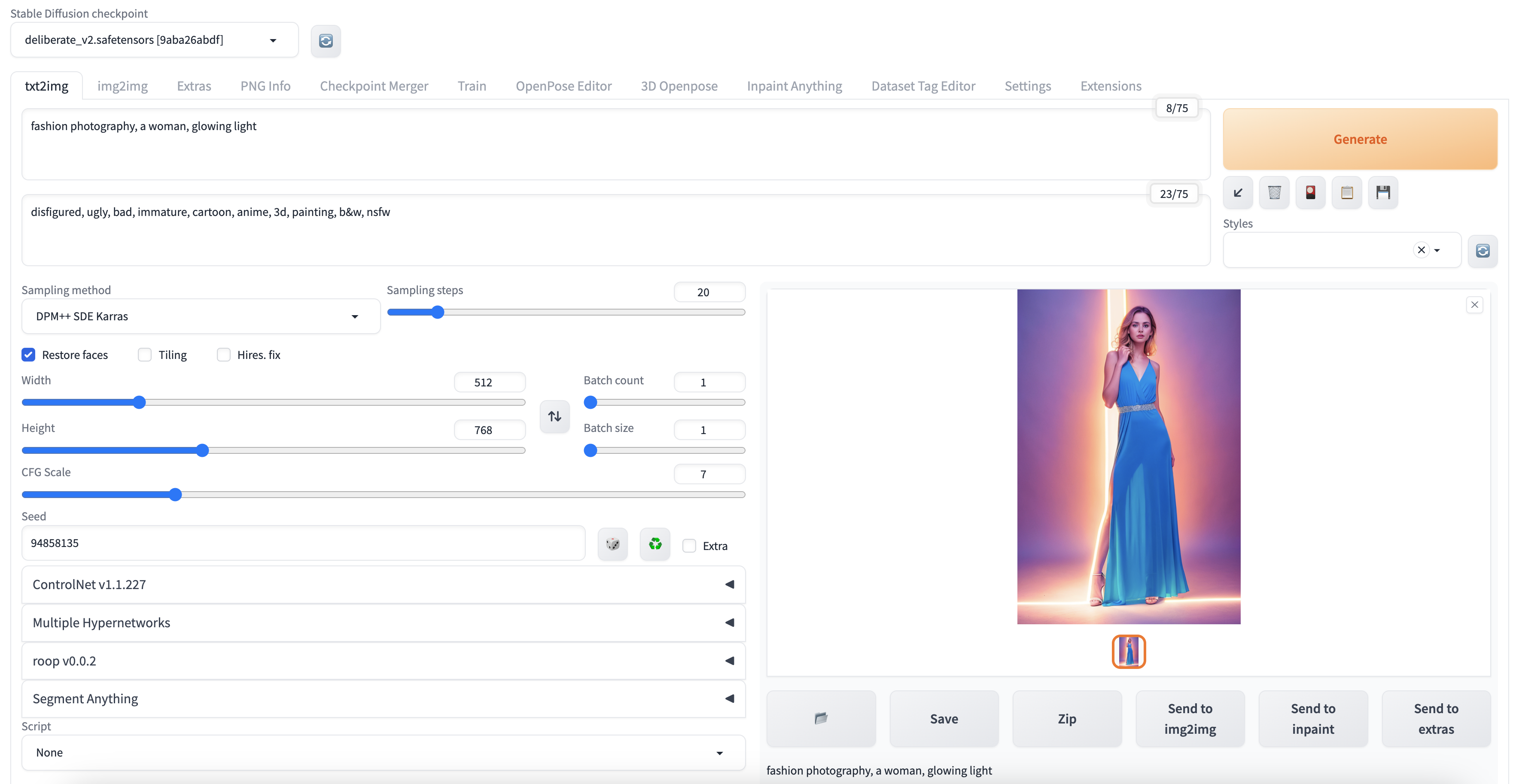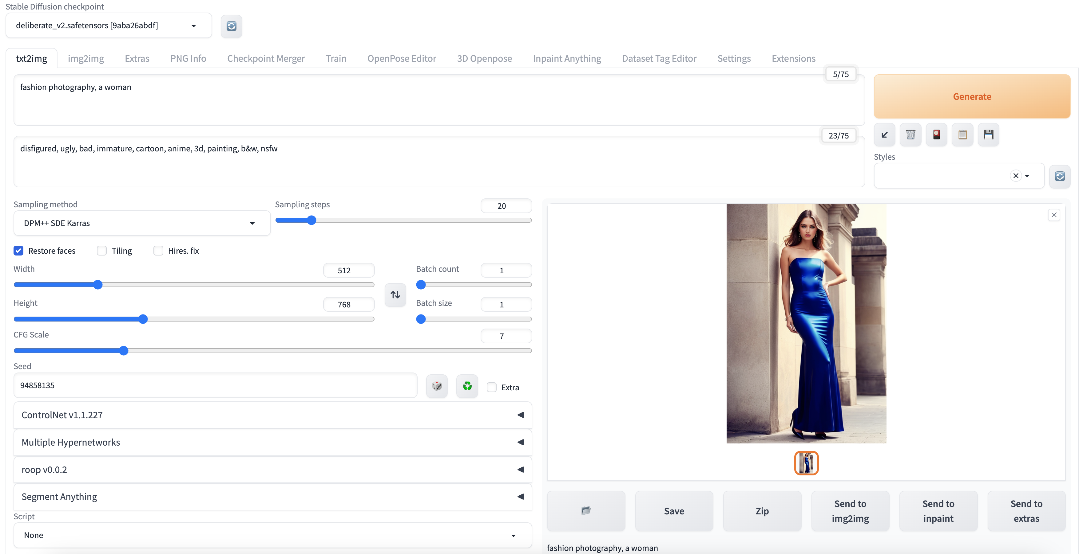 Steps: 20, Sampler: DPM++ SDE Karras, CFG scale: 7, Seed: 94858135, Face restoration: CodeFormer, Size: 512x768, Model hash: 9aba26abdf, Model: deliberate_v2, Version: v1.3.2