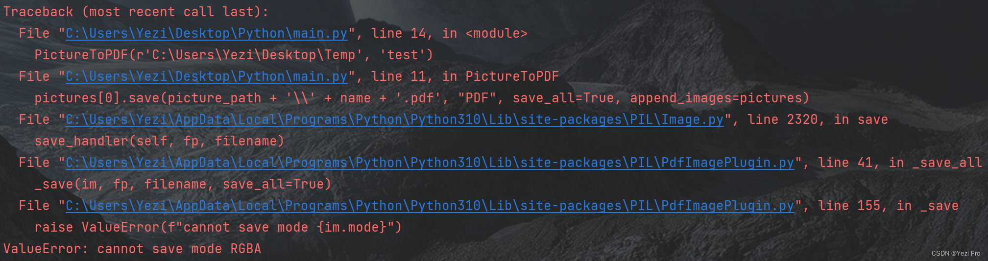 PictureToPDF(r'C:\Users\Yezi\Desktop\Temp', 'test')但这个有缺陷,部分图片转换过程有漏洞,经过多次实验,发现部分图片会出现这种错误: