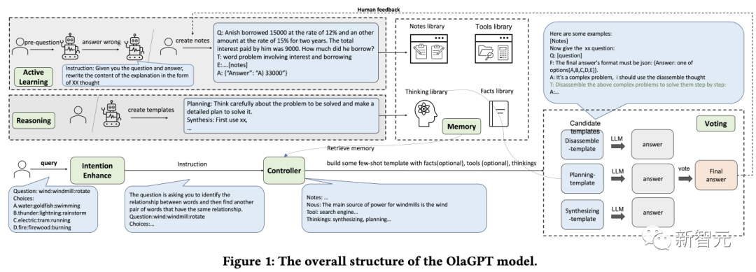 OlaGPT包括多个认知模块,包括注意力、记忆、推理、学习,以及相应的调度和决策机制;受人类主动学习启发,框架中还包括一个学习单元来记录之前的错误和专家意见,并动态参考来提升解决类似问题的能力。