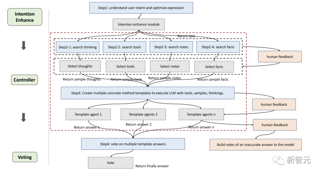 研究人员根据具体实现的需要对该框架进行了微调,并提出了一个适合语言模型解决复杂问题的流程,具体包括六个模块:意图增强模块(注意力)、记忆模块(记忆)、主动学习模块(学习)、推理模块(推理)、控制器模块(行动选择)和投票模块。