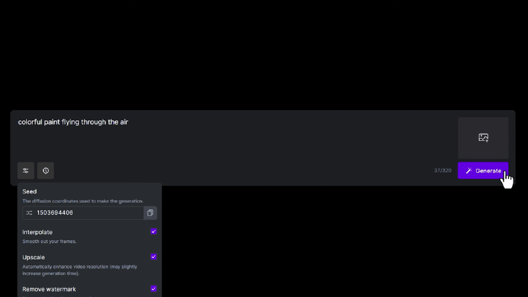 Prompt完成后,你还可以打开选项设置卡,升级你的成果,比如选择插入帧,让视频过渡更平滑,提高分辨率,去除水印等。