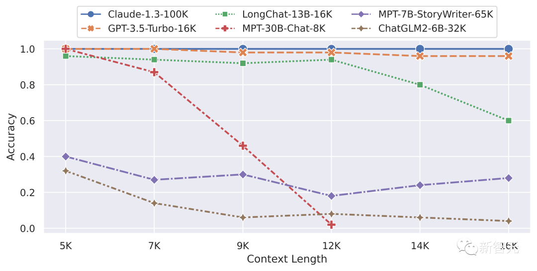 Chatglm2-6B也出现了下降,在研究人员测试的最短长度(5K上下文长度)上表现也不太好。