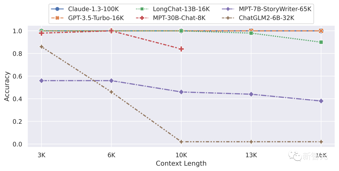 研究人员发现,当上下文长度接近16K时,LongChat-13B-16K在细粒度的行检索任务上出现了准确率下降的情况。