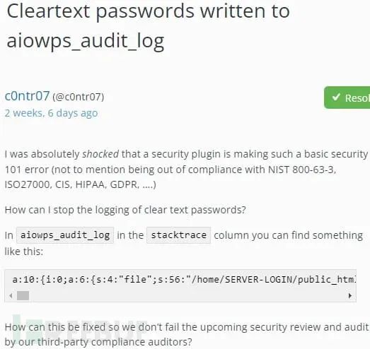 大约在三周前,一位用户反应 AIOS v5.1.9 插件不仅将用户尝试登录记录到 aiowps_audit_log 数据库表中,用于跟踪登录、注销和失败的登录事件,还记录了用了输入的密码。该用户担心此举违反了包括NIST 800-63 3、ISO 27000和GDPR在内的多项安全合规标准。