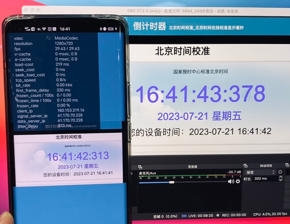 通过快直播ijkplayer demo app拉流播放,对比两端画面,端到端延时在1秒左右。