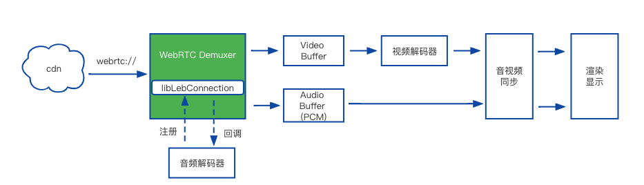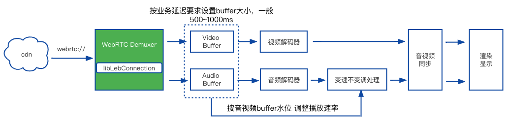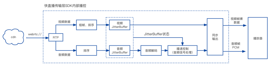 外部播控,即播放器负责播控逻辑,传输层SDK通过demuxer输出音视频裸数据给播放器缓存,播放器根据业务的延迟要求设置缓存大小,再根据缓存状态调整播放速度,以保证缓存保持在一定的区间内。并且由于播放速度的变化,播放器需要对音频数据进行变速不变调的信号处理。