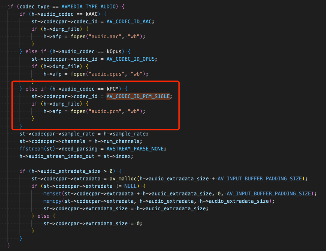 2. 增加PCM解码器配置,codec_id为AV_CODEC_ID_PCM_S16LE