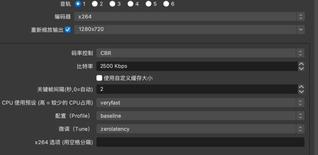 通过obs rtmp推流秒表页面至腾讯云,编码配置如下图,采用720p,baseline,码控CBR,2500kbps,2秒GOP,veryfast,zerolatency模式。
