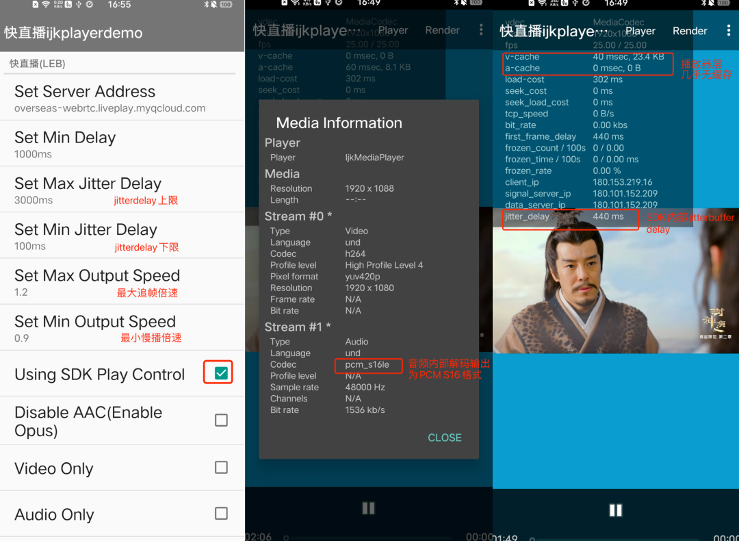 可见传输层SDK内部播控模式能在正常网络下保持较低延迟,而在弱网下自动增大buffer提高弱网抗性,保持流畅播放,一般单纯30%丢包率,jitterbuffer大小在1秒左右。