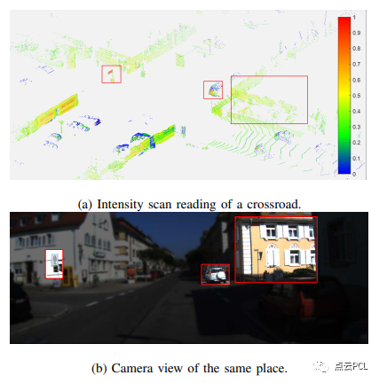 图2:来自KITTI数据集的强度读数示例,强度信息与地标之间的关系用红色矩形进行了标注。
