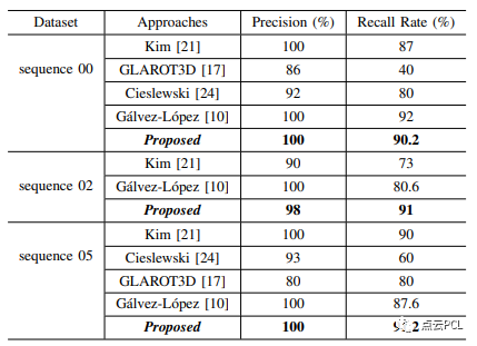 与基于视觉的方法相比,该方法在序列00和序列05上实现了有竞争力的准确率和召回率,在更具挑战性的数据集序列02上,我们的方法实现了更高的召回率,这是因为在序列02中,基于视觉的方法无法识别出反向访问,从而导致召回率显著下降。