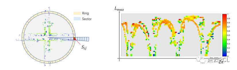 图3:所提出的扫描帧强度上下文的可视化说明。左图:原始点云根据几何特征被分解成子空间。右图:通过在子空间上进行强度投影得到的扫描帧强度上下文。