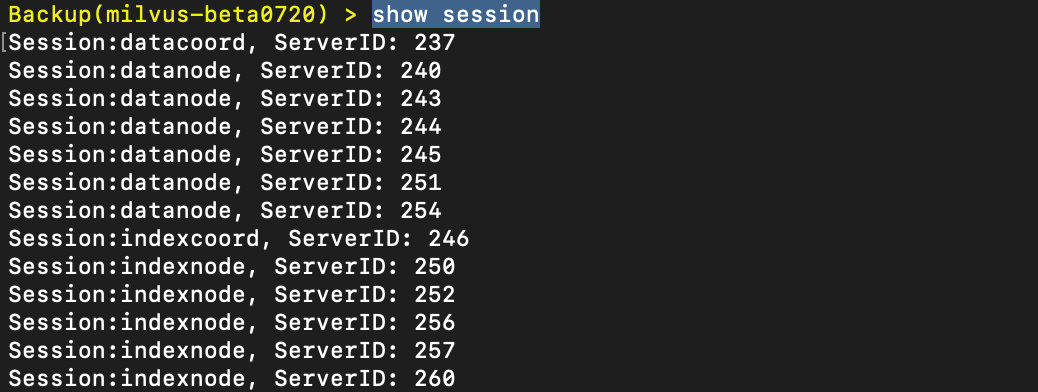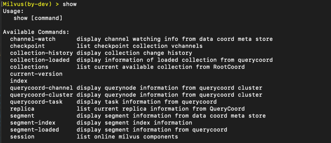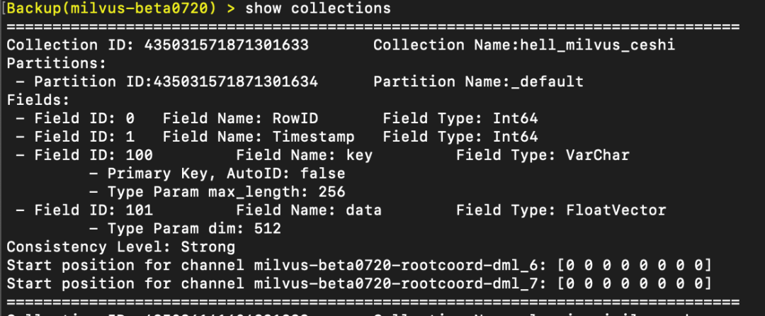 显示所有的 collection 信息,包括 collection & partition id、name;field 信息,默认查询一致性和 channel 信息。