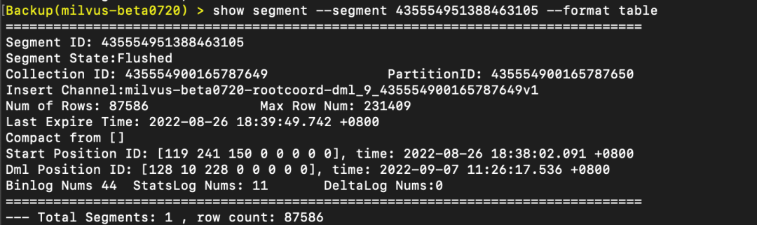 --format table 由 table 形式展示数据,能看到 Max Row Num,DetalLog Nums、Binlog 等信息;还包括 segment 的时间点位信息。这些信息能帮助甄别 segment 状态,以及分析系统预期行为。